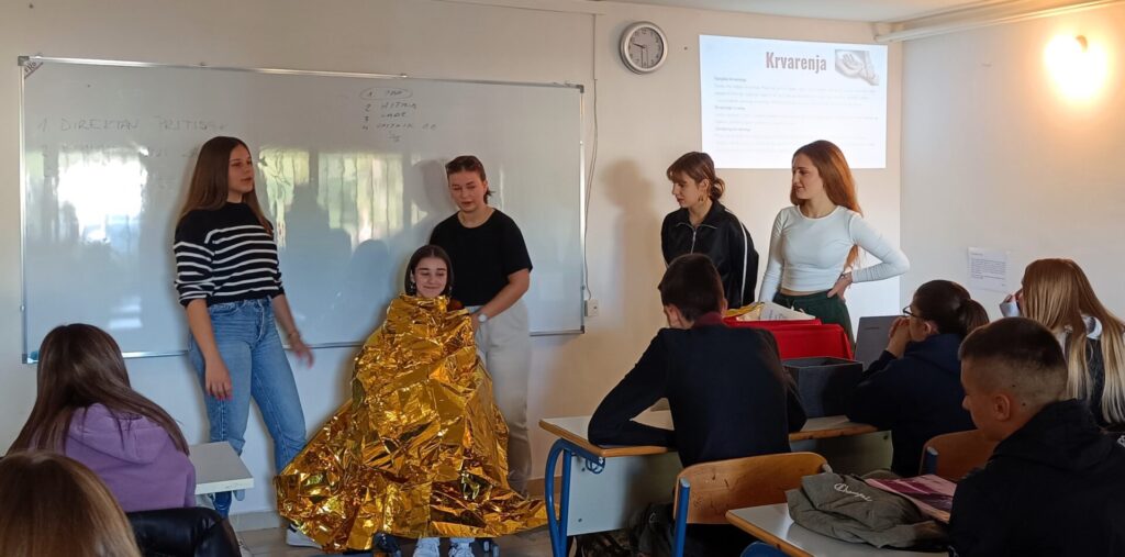 Obilježavanje ovog važnog dana nastavili smo u ponedjeljak u školi gdje smo održali prezentaciju o prvoj pomoći u sklopu zaštite na radu. Prezentacija je bila namijenjena prvim razredima strukovnih smjerova u našoj školi kako bismo osvijestili važnost osnovnih vještina prve pomoći u svakodnevnom životu i radnom okruženju.